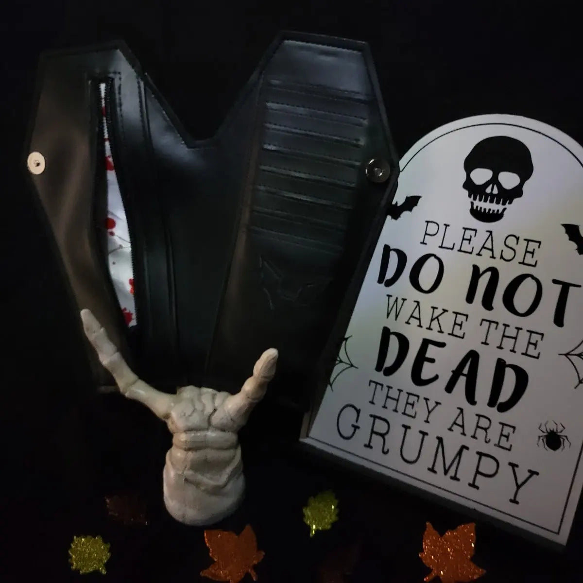 8 card slots, coin pouch lined in blood spatter and 2 compartments for cash.